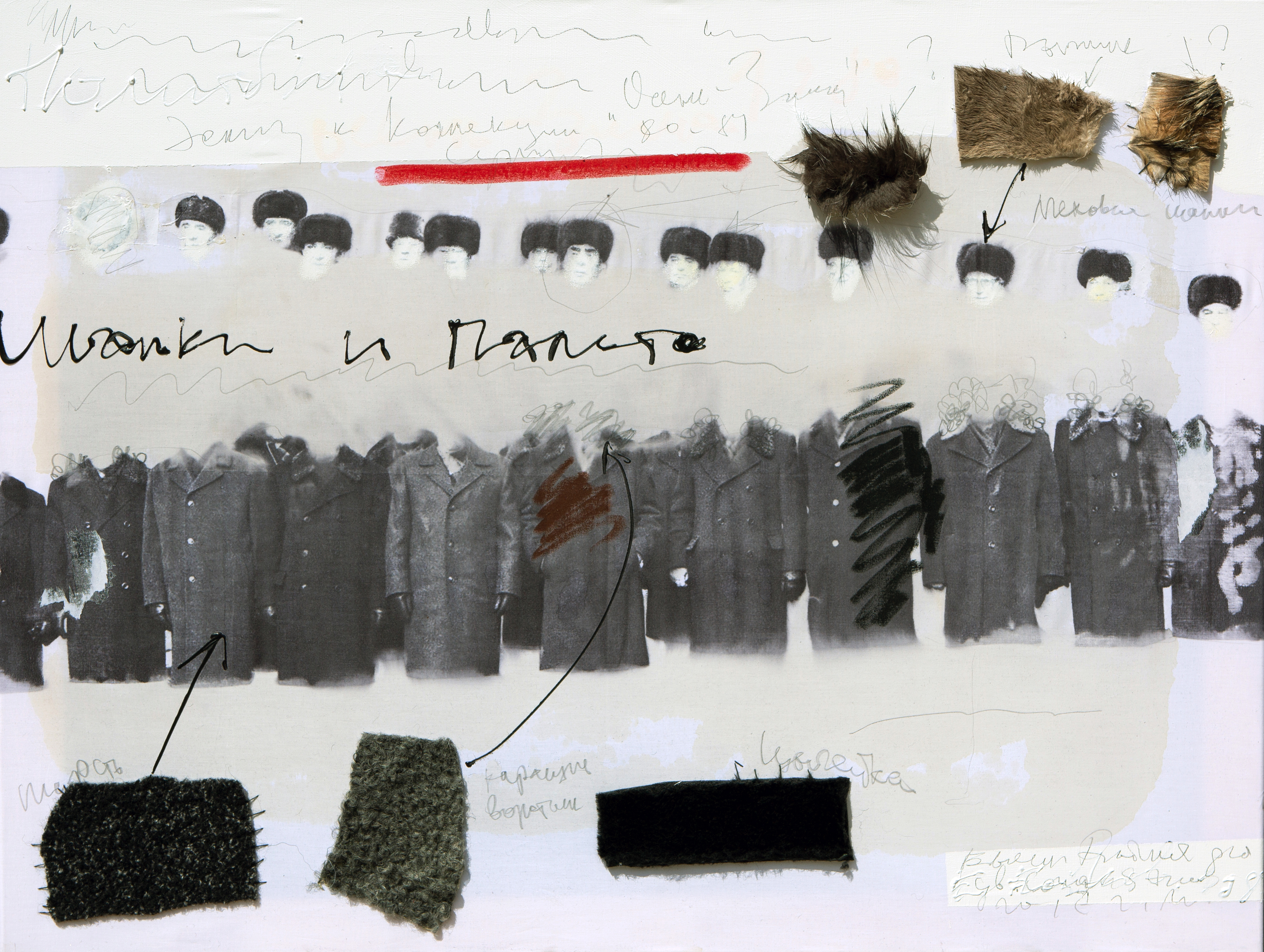 Cotton, acrylic, pencil, fur, fabric samples, imprint of photograph on wet cloth