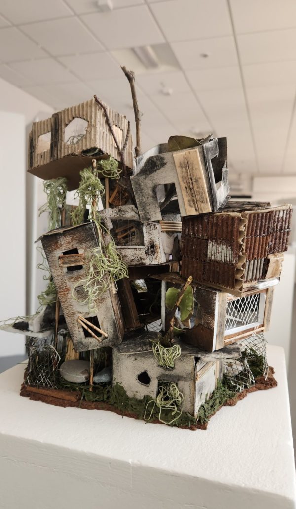 Peep into the houses and try to imagine living here. I want to create awareness about the increasing amount of abandoned houses. The buildings are stacked to symbolise the rising issue, which is paralleled with the growth in homelessness. Even though we do not hear about it often, many houses are being left alone for years at a time, letting nature regenerate and take them over. The burn marks and crumbled walls/floors are the result of a fire that has taken place forcing people to leave their homes and the rust marks suggest that they have been left for a long amount of time. Some of the houses are less stable than others making it look like they are about to fall over and decay even further, which adds to the unease and feeling of instability. There are a few that fall into others, which tells us that not only is it individual houses that collapse and decay, but also whole villages and/or cities.
