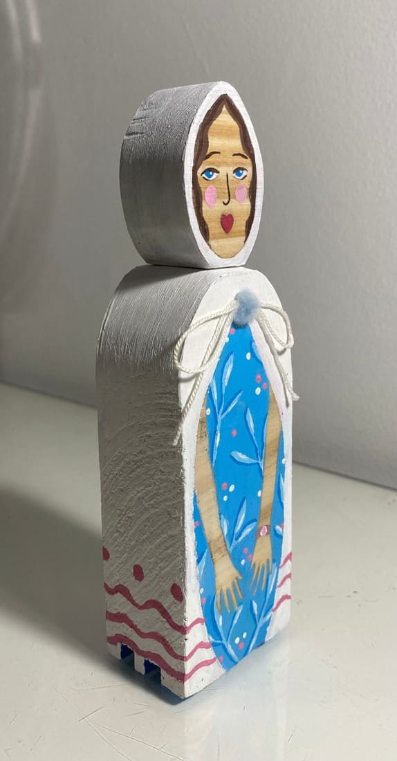 A partir de reaproveitamentos de madeira, com cortes e lixas, moldaram-se as curvas e com uma pincelada de tinta pintaram-se as expressões. Assim criou-se alguém ‘Entre outros bilhões’. Foi esta a proposta dada aos alunos, criar uma boneca através de um material tão simples e natural quanto a madeira, utilizando ferramentas como a mesa de corte, lixadeira, etc para moldar a nossa boneca dando um acabamento suave, com uma lixa e pintando a boneca com tinta acrílica para lhe dar vida com cor. Assim nós alunos, constatámos observamos que arte não são só telas coloridas. Existem vários materiais à nossa disposição que eventualmente se podem eventualmente se transformar em arte. E foi com este conceito de arte e esta proposta de trabalho que me surgiu o nome ‘Entre outros bilhões’ retratando, não só, as inúmeras e mesmo assim únicas bonecas criadas mas também os materiais que poderiam ter sido usados