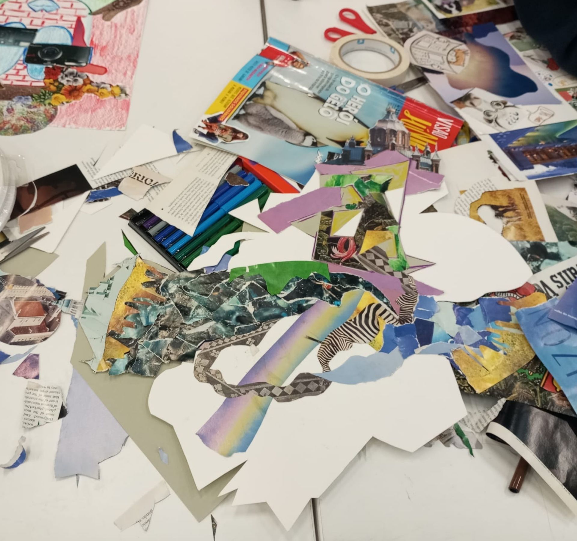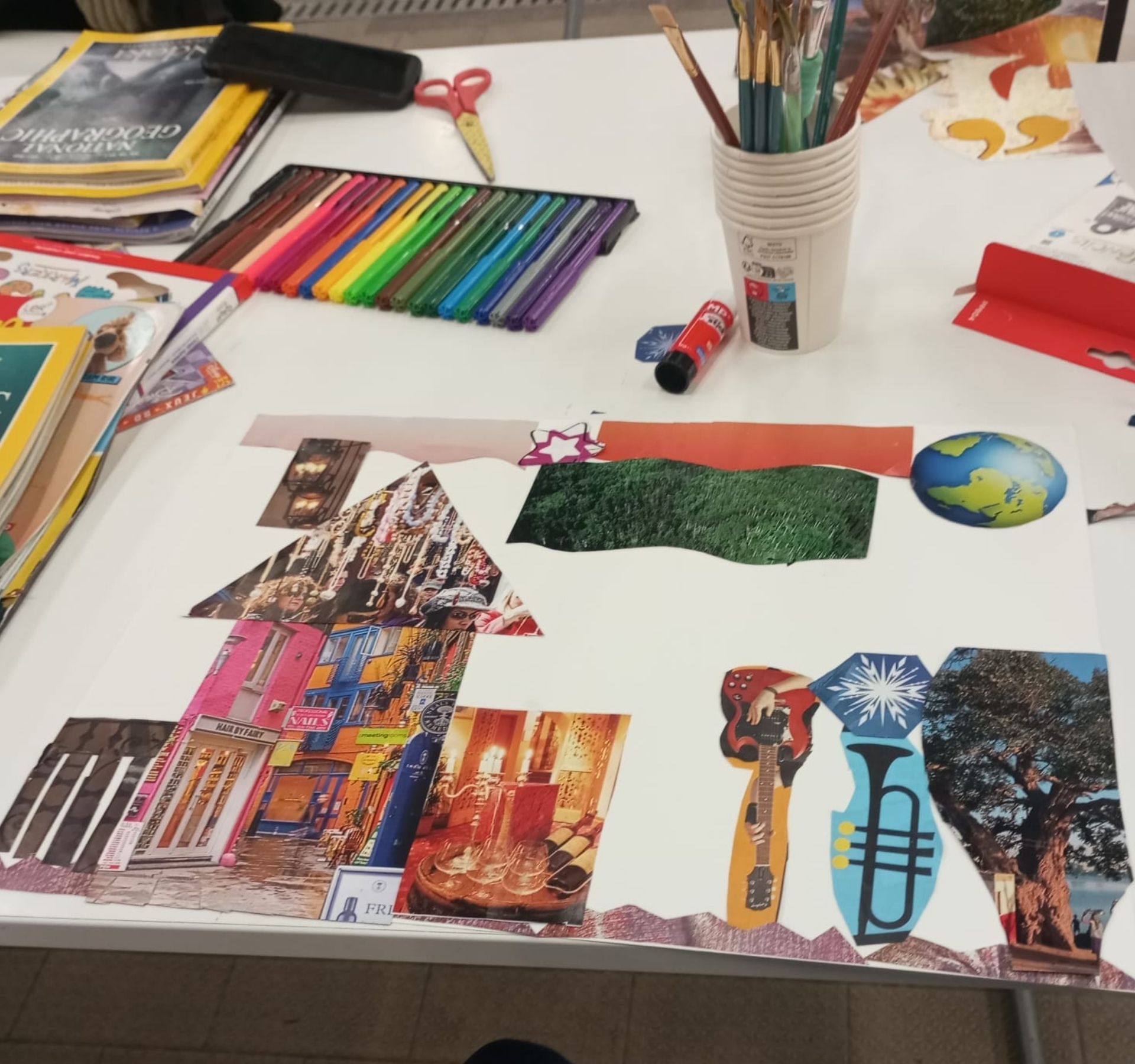 Working together around one table, participants then selected materials and started building their own interpretation of a “house”. We used mixed media such as papers, paints and drawing materials. Some created very literal house forms. Others explored the idea of “house” as a feeling or memory.